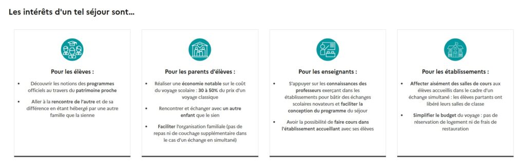 Les élèves sont accueillis dans les familles de l’établissement avec lequel leur établissement fait le séjour ; on supprime alors les frais d’hébergement et de restauration. Le coût d’un voyage scolaire baisse de 40 à 50% ; le séjour est donc plus économique.