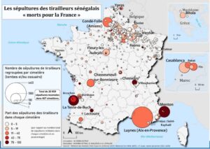 Une seconde carte des sépultures des tirailleurs sénégalais de la Première guerre mondiale montre des localisations surprenantes mais qui s’expliquent par l’histoire spécifique des tirailleurs. Environ 15 000 tombes sont identifiées réparties sur la ligne de front, mais aussi dans le sud-ouest autour d’Arcachon et dans le sud-est (Luynes et Menton). La localisation dans le sud de la France est liée à l’histoire des tirailleurs : ils étaient dit des « combattants saisonniers », retirés du front en hiver car on pensait qu’ils ne supportaient pas les basses températures. Ils sont placés dans le sud pour un hivernage dans des camps de formation autour de Fréjus et près Arcachon. Dans des villes balnéaires comme Menton, les hôtels sont réquisitionnés par l’armée pour les transformer en hôpitaux. Beaucoup y décèdent de blessures de guerre ou de maladies.