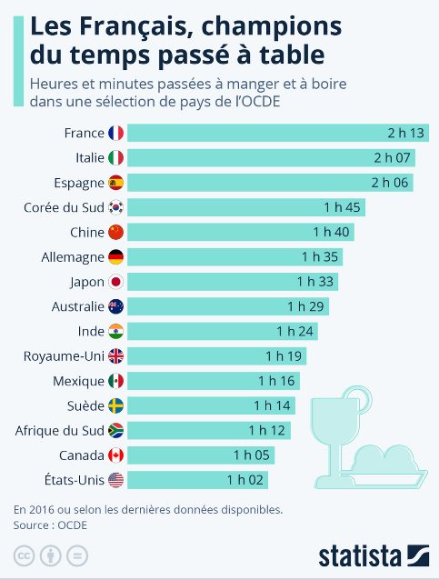 J-R P réagit au tableau sur le temps passé à table. Il compare les temps français, espagnol et italien, des pays catholiques.