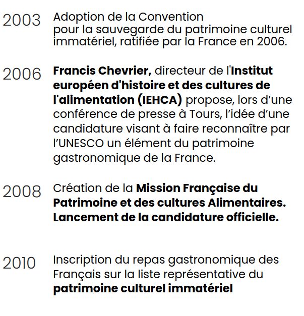 « Le repas gastronomique des Français est une pratique sociale coutumière destinée à célébrer les moments les plus importants de la vie des individus et des groupes, tels que naissances, mariages, anniversaires, succès et retrouvailles. Il s’agit d’un repas festif dont les convives pratiquent, pour cette occasion, l’art du « bien manger » et du « bien boire ». Le repas gastronomique met l’accent sur le fait d’être bien ensemble, le plaisir du goût, l’harmonie entre l’être humain et les productions de la nature. Parmi ses composantes importantes figurent : le choix attentif des mets parmi un corpus de recettes qui ne cesse de s’enrichir ; l’achat de bons produits, de préférence locaux, dont les saveurs s’accordent bien ensemble ; le mariage entre mets et vins ; la décoration de la table ; et une gestuelle spécifique pendant la dégustation (humer et goûter ce qui est servi à table). Le repas gastronomique doit respecter un schéma bien arrêté : il commence par un apéritif et se termine par un digestif, avec entre les deux au moins quatre plats, à savoir une entrée, du poisson et/ou de la viande avec des légumes, du fromage et un dessert. Des personnes reconnues comme étant des gastronomes, qui possèdent une connaissance approfondie de la tradition et en préservent la mémoire, veillent à la pratique vivante des rites et contribuent ainsi à leur transmission orale et/ou écrite, aux jeunes générations en particulier. Le repas gastronomique resserre le cercle familial et amical et, plus généralement, renforce les liens sociaux. » (sur le site officiel de l’Unesco)Une présentation est proposée aux enseignants sur le site Lumni : Le repas gastronomique des Français reconnu par l’Unesco