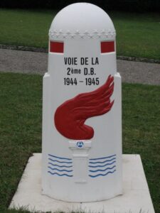 La Fondation maréchal Leclerc de Hauteclocque a voulu se donner une assise territoriale, par la création de la Voie de la 2e DB. 2900 communes ayant été traversées par la 2e DB depuis Saint-Martin de Varreville (sur cette commune, à Utah Beach, débarqua la 2e DB), jusqu’à Strasbourg (puis à Berchtesgaden), il s’agit de les relier par la pose de bornes symboliques. La Voie de la 2ème DB s’apparente à la Voie de la Liberté dont elle a repris le symbolisme, mais s’en distingue par son tracé qui suit le chemin parcouru par la Division Leclerc. Les Bornes du serment de Koufra ont l’aspect des bornes de la Voie de la Liberté, avec notamment : le flambeau de la statue de la Liberté sortant des flots de l’Atlantique, l’insigne Ⓐ de l’Armée Patton sur le flambeau, les 48 étoiles de la bannière américaine de l’époque, mais s’en distinguent par l’insigne de la 2ème DB, l’inscription « Borne du serment de Koufra », l’inscription « Voie de la 2ème D.B. 1944-1945 », la distance entre St Martin de Varreville et le lieu de la borne.