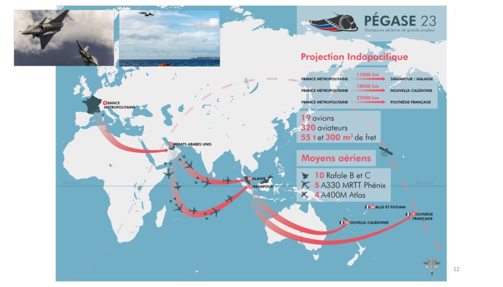 Cette politique de défense se retrouve dans l’opération Pégase, exercice de projection avec des rafales et 5 avions de ravitaillement (A330RT), mais qui peuvent aussi transporter un nombre important de troupes, et puis 4 A400M qui sont des avions de transport, de frais et de transport de personnel. Cela fait un ensemble d’une vingtaine d’aéronefs qui ont été projetés sur 20/25000 km en quelques jours de de manière extrêmement efficace et qui au cours de leurs « escales » ont participé à un certain nombre d’activités de coopération avec les Émirats arabes unis, la Malaisie, Singapour, l’Inde et les États-Unis qui ne sont pas mentionnés. Donc la projection de puissance est l’une des clés de notre crédibilité dans la zone et l’une des façons de compenser un dispositif unitaire somme toute assez limité.