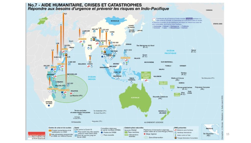 L’enjeu de l’aide humanitaire environnemental est important et montre la capacité, la démonstration que veut faire la France dans sa protection de l’environnement et dans l’aide des pays qui sont menacés ou victimes de ces menaces (catastrophes naturelles.) Exemple des accords FRANZ signifiant France, Nouvelle-Zélande, Australie qui ont 30 ans et qui coordonnent les aides entre ces pays lorsqu’il s’agit d’aider un pays victime d’une catastrophe humanitaire. Ils ont bien fonctionné en 2021 en Papouasie, en 2020 et 2023 au Vanuatu et en 2022 aux îles Tonga. Les forces armées ne sont pas les dernières à fournir des capacités, on y retrouve un rôle capital des organisations non gouvernementales. Et puis l’aide alimentaire française est évidemment importante. J’ai peu évoqué l’Afrique de l’Est qui fait partie de cet espace et qui en bénéficie. En mettant en place une stratégie, la France permet aussi à l’Union européenne de peser plus dans la zone. Depuis maintenant 2 ans, il existe une stratégie de l’Union européenne dans l’indopacifique qui ressemble fortement à la stratégie française qui en a eu l’idée. Il est donc essentiel que la France inscrive son action dans celle de l’Union européenne notamment sur ces sujets d’enjeux environnementaux et d’aide au développement.