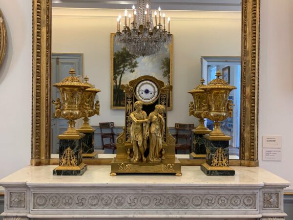 Les premières pièces nous font pénétrer dans l’intérieur cossu mais sévère d’une demeure Empire. On y trouve en particulier une salle à manger et un bureau, à la décoration élégante, avec moulures, soubassements menuisés et quelques discrètes frises ouvragées, tantôt peintes, tantôt sculptées. Par endroits, la douceur des nuances bleues et blanches rappelle la délicatesse du goût Wedgwood. La présence de petites tours dans les angles du bâtiment permet quelques pièces en rotonde qui allègent la raideur générale du style.