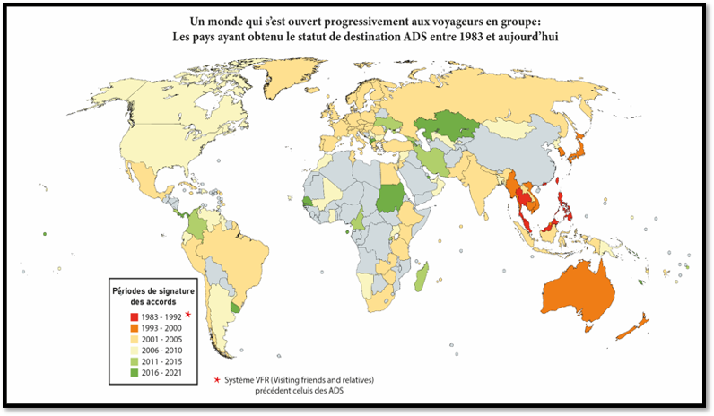 Puis en 1997 le système « Approved Destination Status» permet aux agences de voyage chinoises d’ouvrir les destination vers la Corée du Sud (1998), Nouvelle-Zélande et Australie (1999), Japon (2000), Russie (2002) et enfin l’espace Schengen (2004). Ainsi 29 millions de Chinois étaient partis à l’étranger en voyage en 2004.