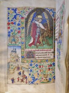 Les Heures de Pierre II de Bretagne (BnF, ms. Latin 1159) sont ouvertes au feuillet qui figure un saint Michel terrassant le dragon, accompagné dans la marge d’une scène de procession vers le Mont-Saint-Michel (f°160v). Celle-ci fait écho aux Heures de Marguerite d’Orléans (BnF, ms. Latin 1156B) où une belle et pittoresque marge montre le pèlerinage à Saint-Jacques de Compostelle (f°25). Peut-être d’origine parisienne, le Maître de Marguerite d’Orléans reflète bien l’itinérance des artistes à la faveur des commandes. Imprégné de l’art des frères Limbourg en s’installant à Bourges, côtoyant probablement le Maître de Rohan à Angers, il exploite aussi des modèles du Maître de Boucicaut. L’originalité de cet artiste réside dans l’application à proposer des saynètes vivantes.