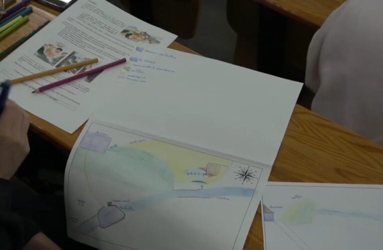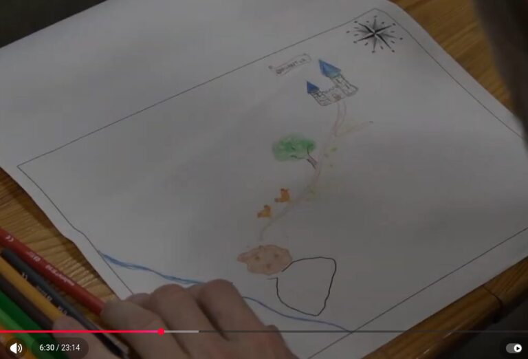 Consigne : voilà un texte et une amorce de fond de carte. Vous avez 1h30, des crayons de couleurs, représentez cette histoire en carte.