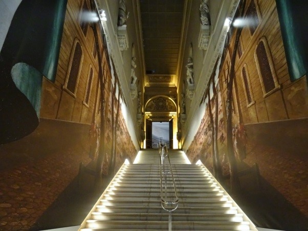 Pour la première fois, sont évoqués les visiteurs de Versailles, capitale choisie par le roi soleil à partir de 1682. Point d’orgue d’un pouvoir ostentatoire, le château est voulu par Louis XIV comme l’écrin où vivent le roi et de sa cour, le théâtre du pouvoir et le siège de son gouvernement. Rien n’est trop beau pour émouvoir, étonner et éblouir tous ceux qui viendront paraître, contempler et nul doute admirer le roi du plus grand royaume d’Europe. Cette mise en abyme du visiteur qui visite nous enchante comme furent enchantés les visiteurs d’autrefois qui découvrent l’escalier de marbre ou la galerie des Glaces.
